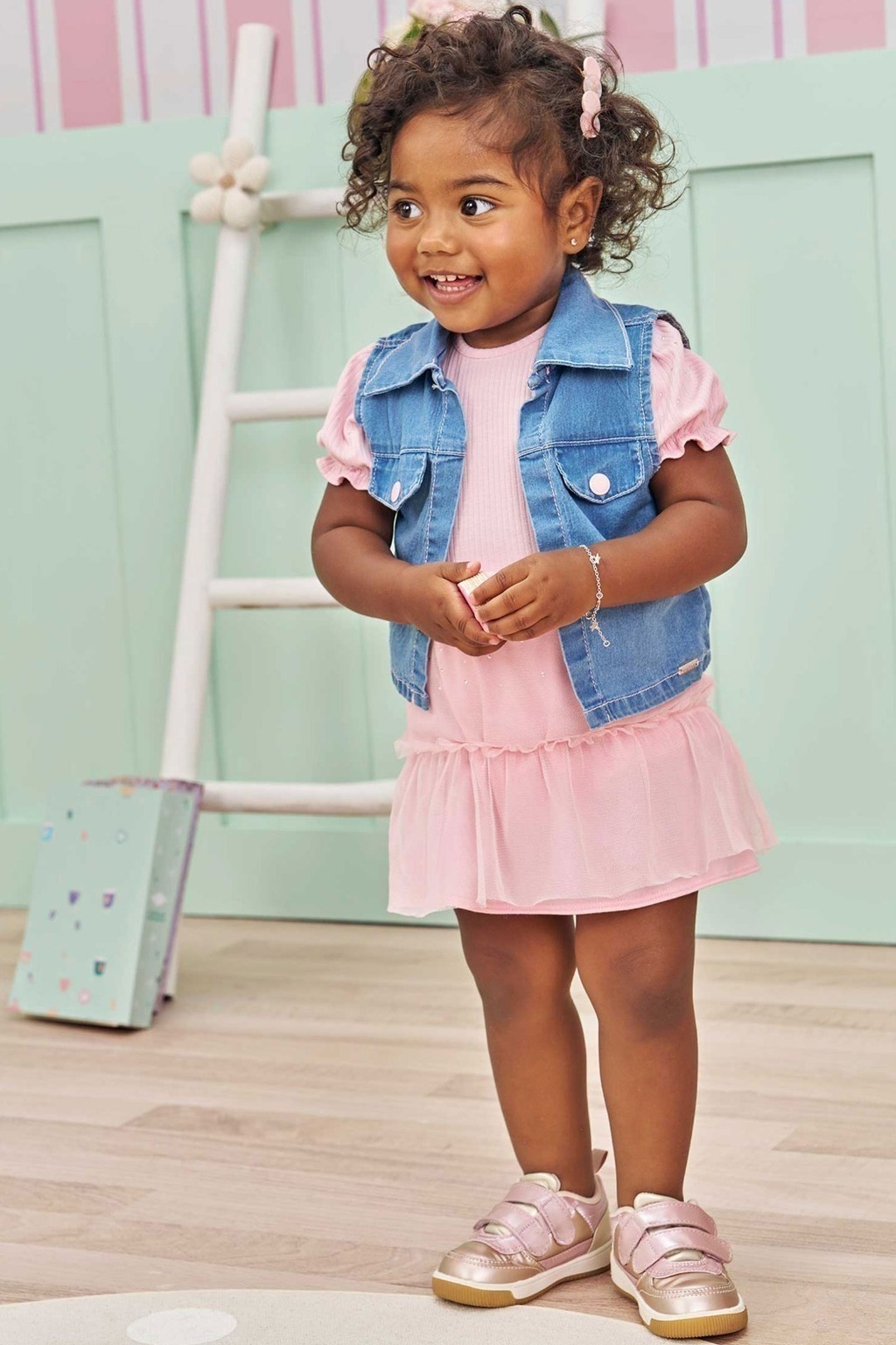 Lindo conjunto com jaqueta jeans, saia e blusa.