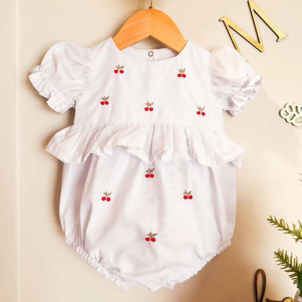 Lindo romper com o tema cereja, branco acompanhado de babados na cintura!