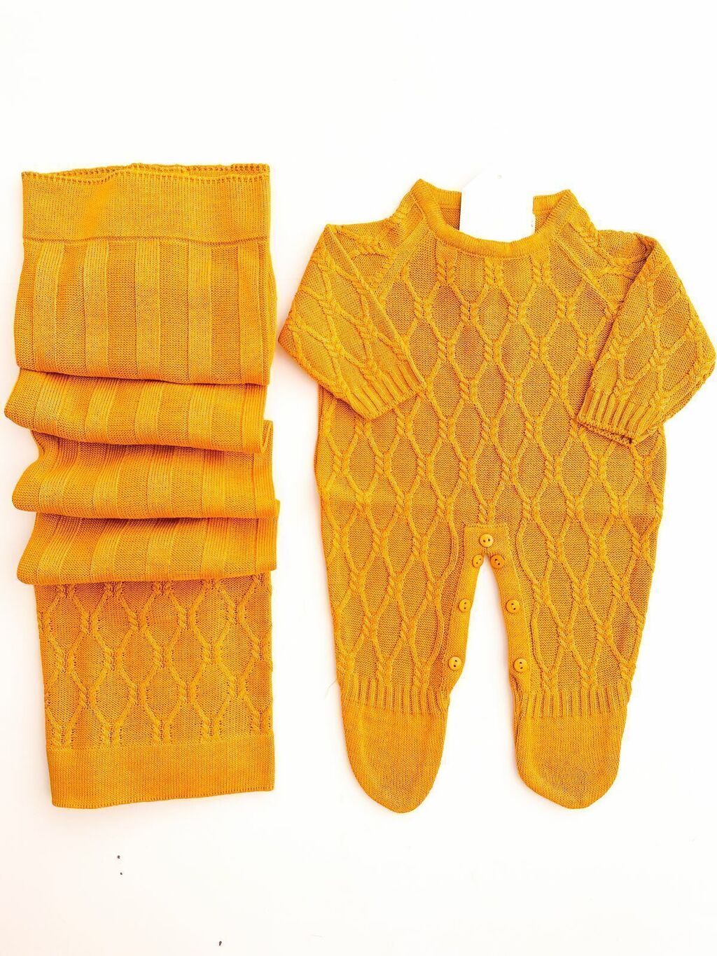 Saída de maternidade composta por macacão e manta em tricot na cor mostarda.