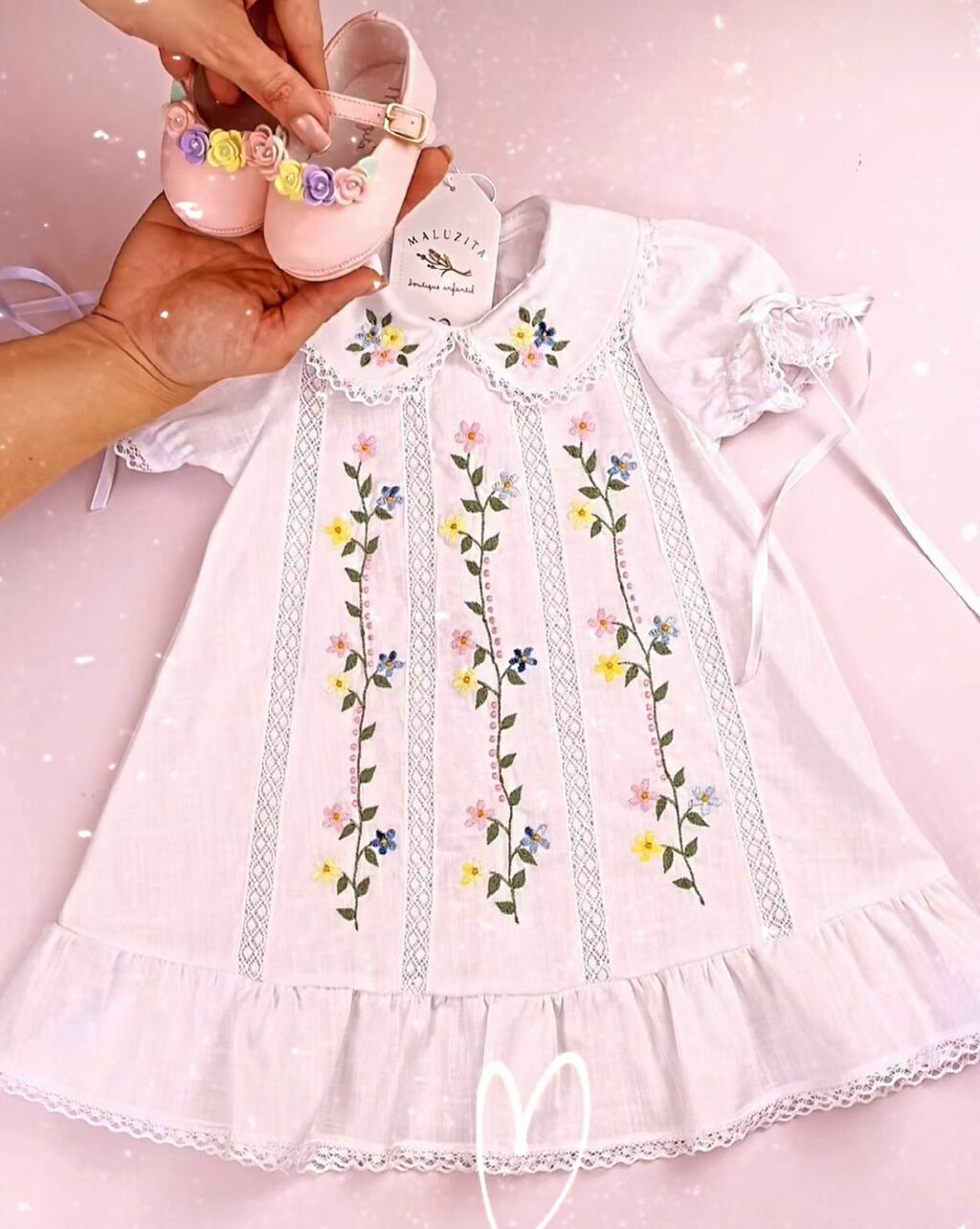 Lindo vestido em algodão finamente bordado à mão, adornado com renda Paraíba! Um primor!Obs: Não acompanha calcinha! Tabela de medidas (Comprimento x busto) 6-12: 47 cm x 30 cm 1-2 anos: 50 cm x 32 cm