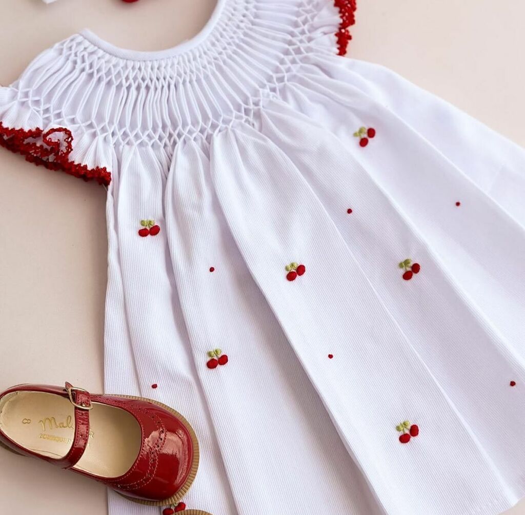 Lindo vestido casinha de abelha, bordado com cerejas. Confeccionado artesanalmente com amor a cada ponto em tecido leve e confortável 100% algodão! TABELA DE MEDIDAS:3-6 meses: 38 cm6-12 meses: 39 cm1 Ano: 40 cm*medidas do ombro até a barra