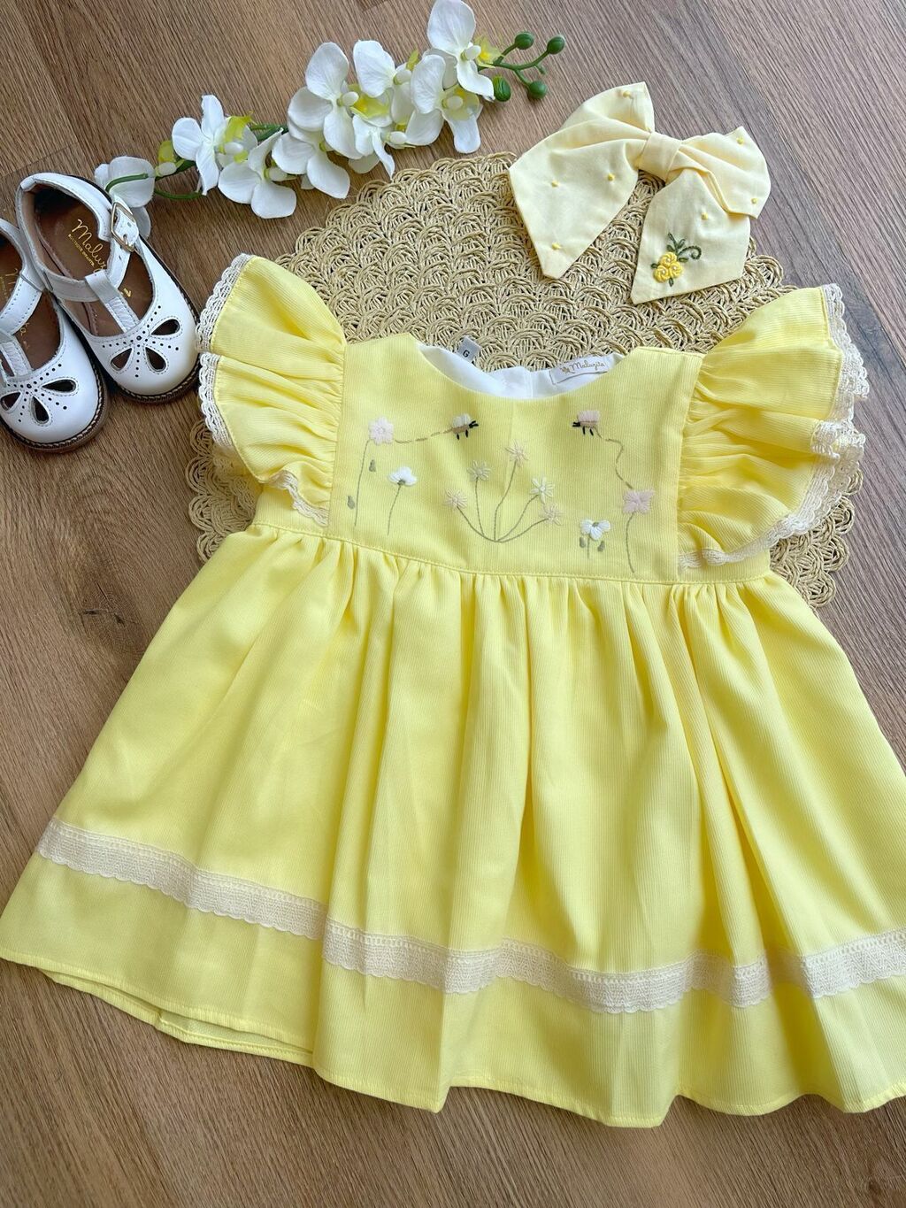 Lindo vestido inteiramente bordado à mão, com saia rodada e forrada! Delicadeza sem fim!