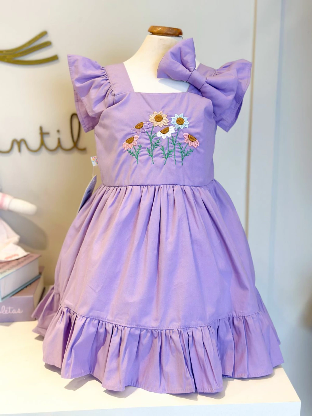 Vestido lindo, bordado na cor lilás com um laço de brinde